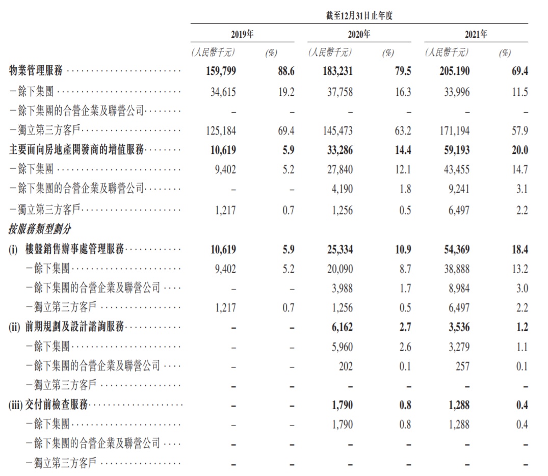 公司自物业管理服务产生大部分收入,分别占2019年、2020年及 2021年总收入约88.6%、79.5%及69.4%。公司的主要面向房地产开发商的增值服务自2020 年取得显著增长。由于公司持续努力向房地产开发商推广公司增值服务,特别是楼盘销售办事处管理服务,收入比例由2019年约5.9%增加至2020年约14.4%,并进一步增加至 2021年约20.0%。