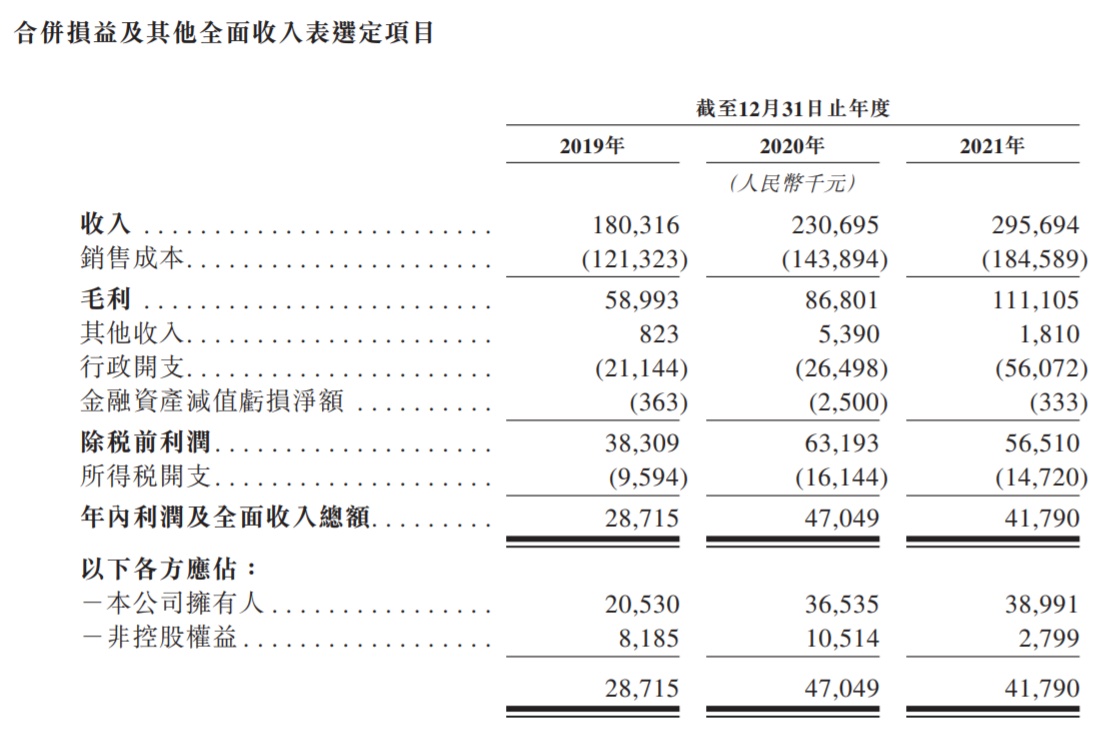 公司于往绩记录期经历持续稳定增长。收入由2019年的1.8亿元增加至2021年的2.96亿元(人民币,下同),复合年增长率约为 28.1%;毛利由2019年的5900万元增加至2021年的1.11亿元,复合年增长率约为37.2%。净利润由2019年的2871万元增加至2021年的 4179万元,复合年增长率约为20.7%。