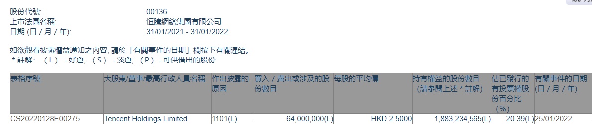智通财经APP获悉,香港联交所最新资料显示,1月25日,腾讯控股(00700)增持恒腾网络(00136)6400万股,每股作价2.5港元,总金额为1.6亿港元。增持后最新持股数目约为18.83亿股,最新持股比例为20.39%。