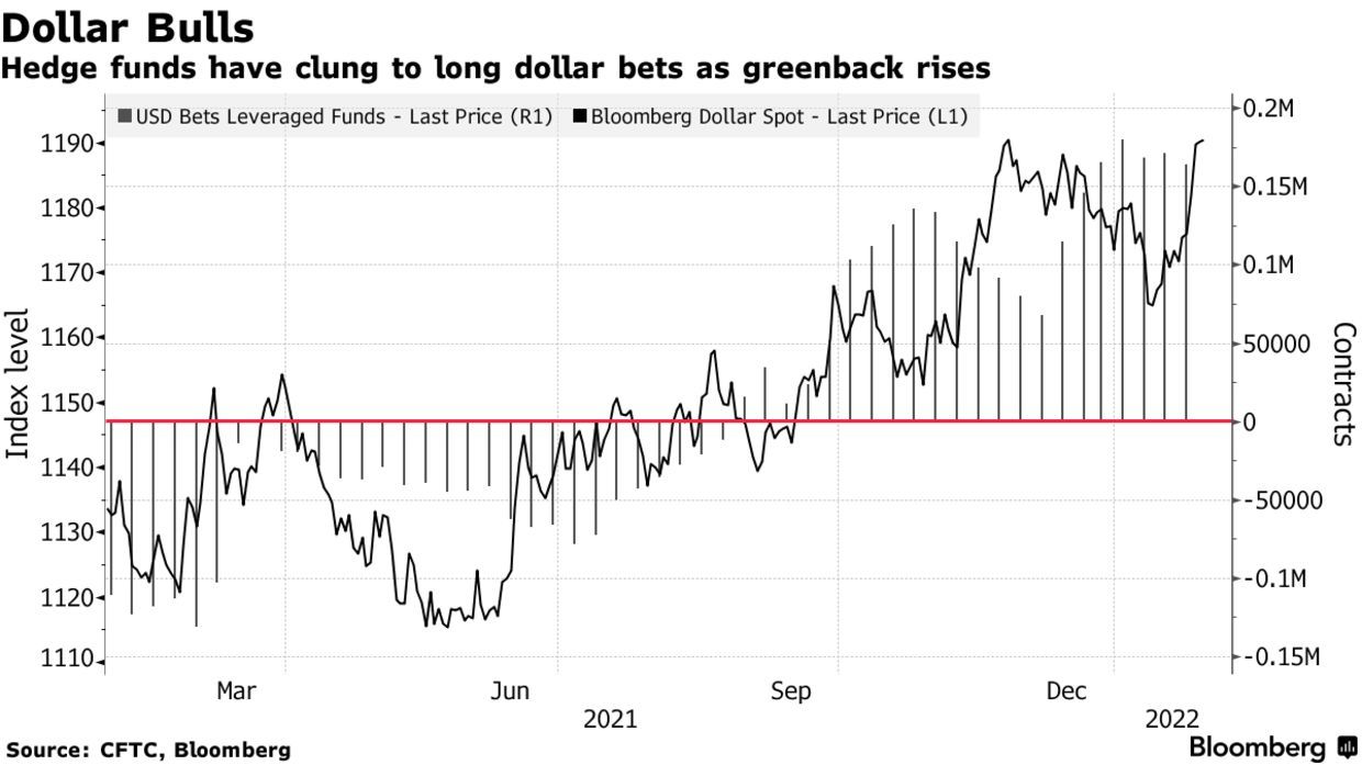 在美国两年期国债收益率飙升至疫情前水平之后,鲍威尔的鹰派言论再次点燃了对美元的看涨交易,上周晚些时候,Bloomberg美元现货指数升至18个月以来的最高水平。
