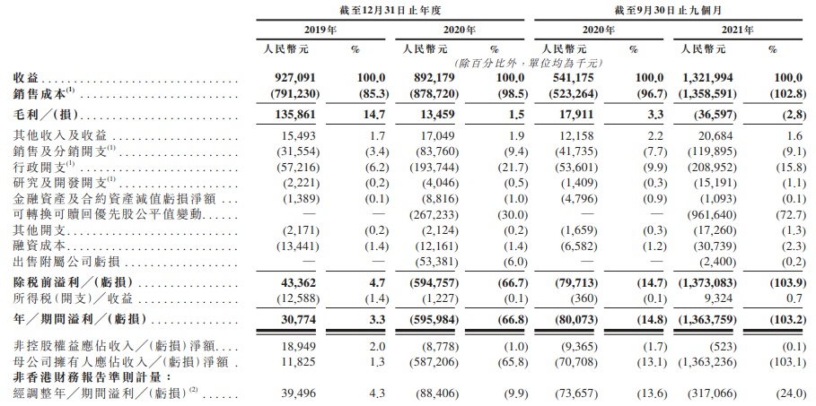 截至2019年、2020年、2021年9月30日止年度,公司的收益分别为9.27亿元、8.92亿元、13.22亿元(人民币,下同);该期间的毛利为1.36亿元、0.13亿元、-0.37亿元。