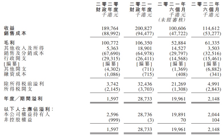 截至2020年、2021年度,公司的收益分别约为1.90亿元、2.01亿元(港元,下同);该期间的毛利为1.01亿元、1.06亿元。