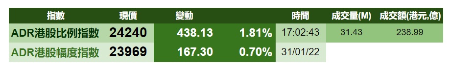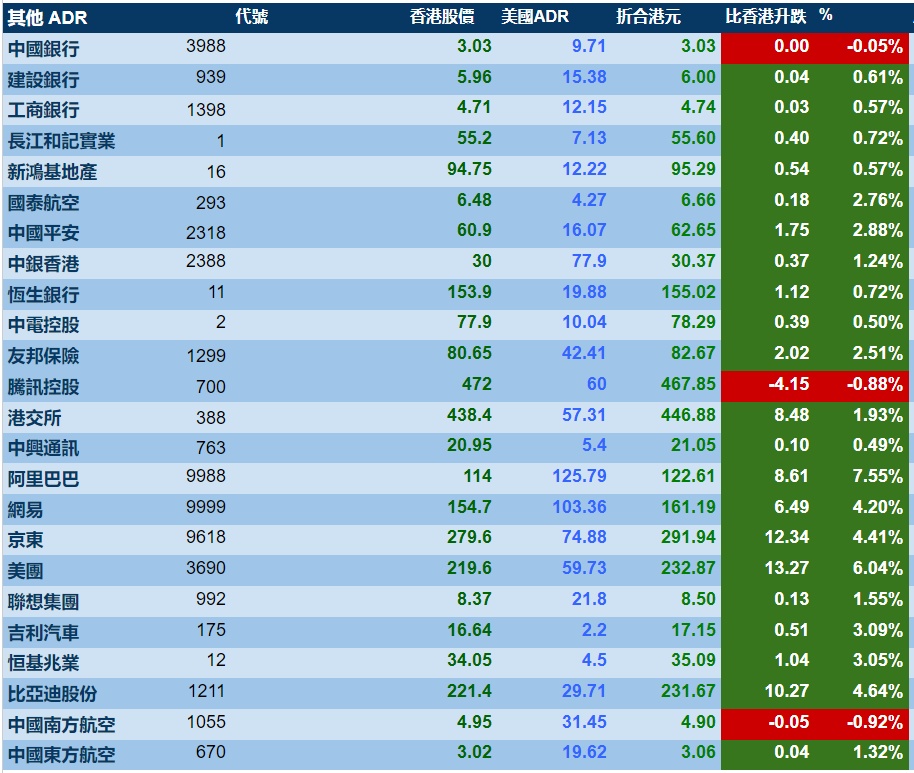 智通财经APP获悉,周一美股三大指数悉数上涨,港股ADR指数,按比例计算,收报24240点,涨438.13点或1.81%。