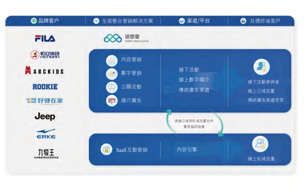 透过整合营销解决方案服务,多想云可为客户提供线上线下营销解决方案服务,增强其品牌及产品的认知度及人气。于往绩记录期间,逾200名客户委聘多想云提供整合营销解决方案服务,于快消品及鞋服行业尤其成功。多想云的客户品牌包括:鸿星尔克、ABCKids、韩后、立白、斐乐、金冠、361度、贵人鸟、盼盼、恒安、安井、华润置地及万科。