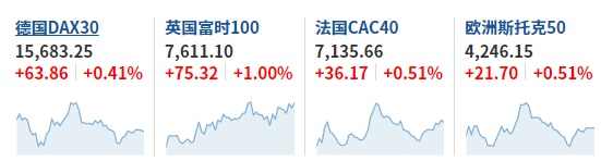 2. 截至发稿,德国DAX指数涨0.41%,英国富时100指数涨1.00%,法国CAC40指数涨0.51%,欧洲斯托克50指数涨0.51%。