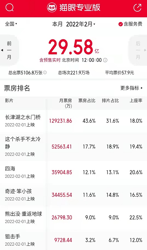 智通财经APP获悉,2月3日,据猫眼专业版数据, 截至2022年2月3日12时,2022春节档档新片总票房(含预售)达29.58亿。《长津湖之水门桥》票房达12.92亿,位居春节档榜首。《这个杀手不太冷静》、《四海》分别位列第二、第三,总票房分别为5.25亿元、3.59亿元。
