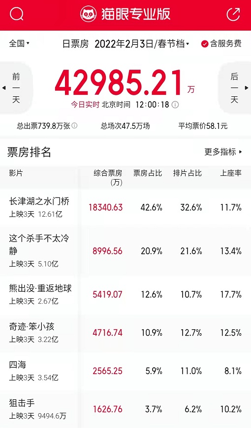 2月3日,《长津湖之水门桥》当日票房仍居首位,共计1.83亿元。《这个杀手不太冷静》、《熊出没·重返地球》分别位列第二、第三,当日票房分别为8996.56万元、5419.07万元。