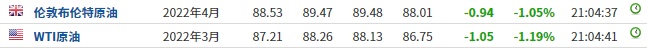 3. 截至发稿,WTI原油跌1.19%,报87.21美元/桶。布伦特原油跌1.05%,报88.53美元/桶。