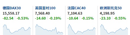2. 截至发稿,德国DAX指数跌0.53%,英国富时100指数跌0.19%,法国CAC40指数跌0.15%,欧洲斯托克50指数跌0.55%。