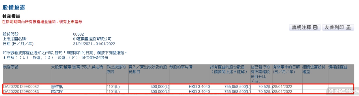 智通财经APP获悉,香港联交所最新资料显示,2022年1月28日,中汇集团控股有限公司(00382) 获董事长廖榕就先生在场内以每股均价3.404港元(最高价3.42港元)增持30万股,涉资约102万港元。增持后,廖榕就先生最新持股数目为755,858,500股,持股比例由70.49%上升至70.52%。