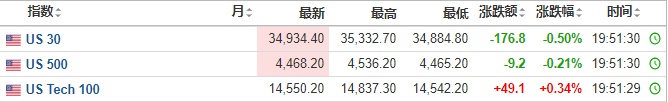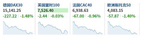 2.截至发稿,德国DAX指数跌1.48%,英国富时100指数跌0.03%,法国CAC40指数跌0.96%,欧洲斯托克50指数跌1.40%。