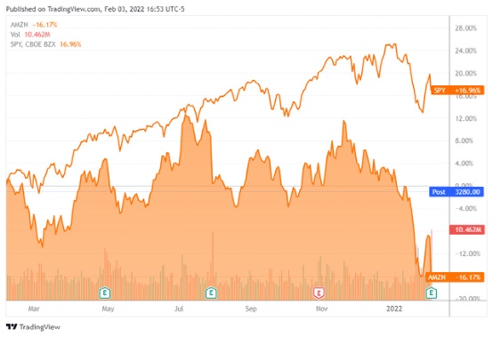 过去一年,随着 SPDR & P 500 Trust ETF ( SPY ) 上涨 16.96%,AMZN 一直落后于市场,而 AMZN 的股价则下跌了 -16.17%。自 2020 年 COVID 崩盘以来,AMZN 也一直落后于市场,因为 SPY 反弹了 88.23%,而 AMZN 增长了 51.74%。在盘后活动之前,亚马逊的股票自 2020 年 6 月以来一直在盘整,他们所做的一切都没有改变。2020年,我们看到成长型公司纷纷竞购,因为许多年轻公司成为市场宠儿,不容错过。2021年对许多大流行的佼佼者来说是一场灾难,但 AMZN 只是横盘整理。