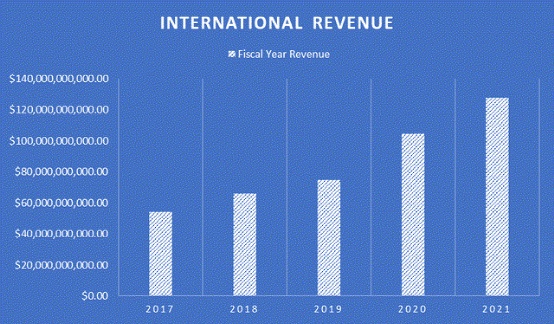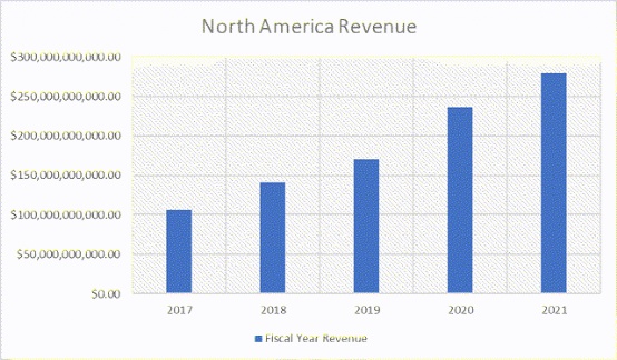 在 AMZN 的公司内,每个业务部门都继续经历非凡的增长。北美虔诚地同比增加了数百亿美元的收入。2018年北美收入同比增长33.26%,2019年增长 20.79%,2020 年增长 38.35%,2021 年增长 18.42%。AMZN 来自北美的收入为 2798.3 亿美元,同比增长 435.3 亿美元。