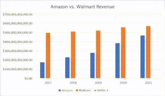 沃尔玛(WMT) 几十年来一直是零售业的主导力量,据我所知,它是美国最大的创收公司,随着时间的推移,AMZN 在 WMT 上不断取得进展。截至 2017 年底,AMZN 创造了 WMT 年收入的 36.61%,因为 WMT 与 AMZN 相比,该年的收入增加了 3080.1 亿美元。在过去四年中,AMZN 缩小了差距,到 2021 年,WMT 创造了 82.14% 的年收入,其中 1021.6 亿美元将这些公司分开。过去四年,WMT 的年均收入增长率为 3.42%,而 AMZN 的年均增长率为 27.68%。如果 WMT 以年均增长率增长,到 2025 年将产生 6543.1 亿美元的收入。如果 AMZN 的增长率下降到 10%,它将在 2025 年超过 WMT,产生 6878.3 亿美元的收入。如果 AMZN 能够以 10% 的年复合增长率同比增长。