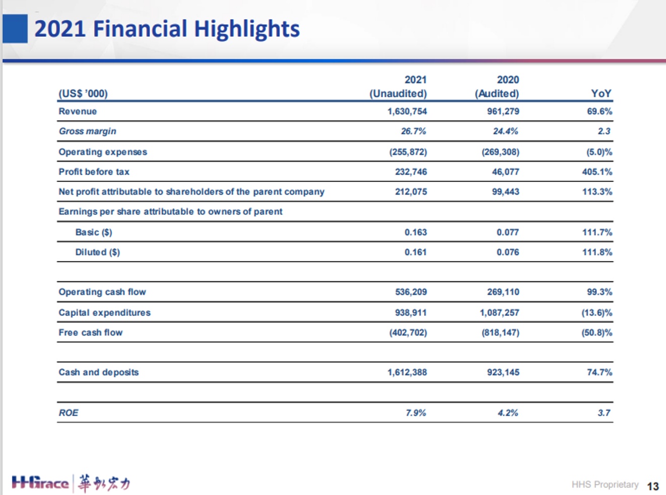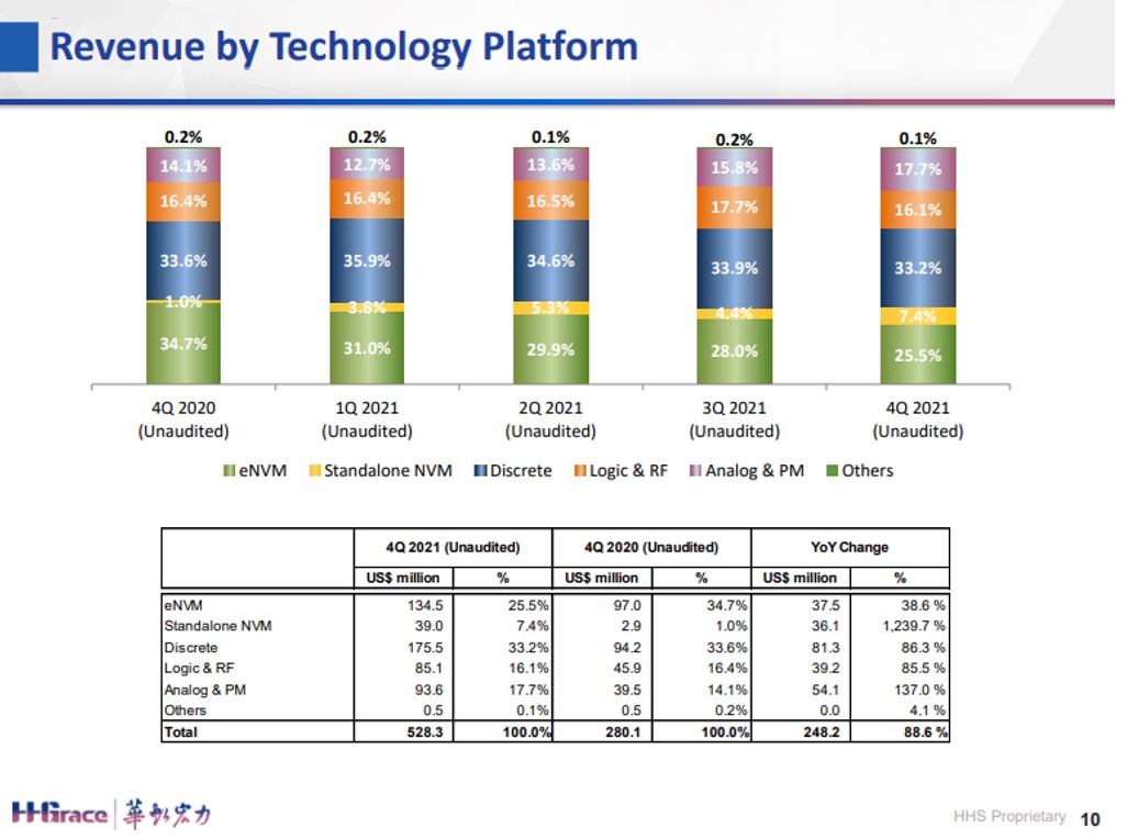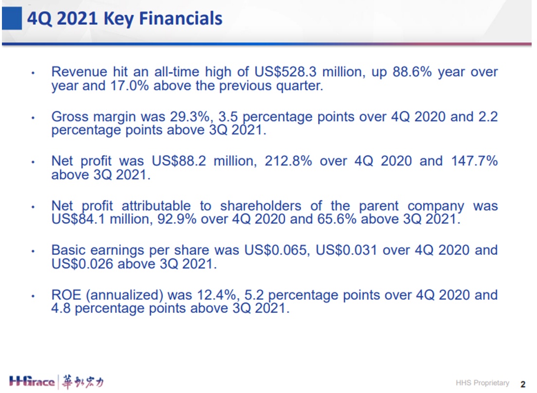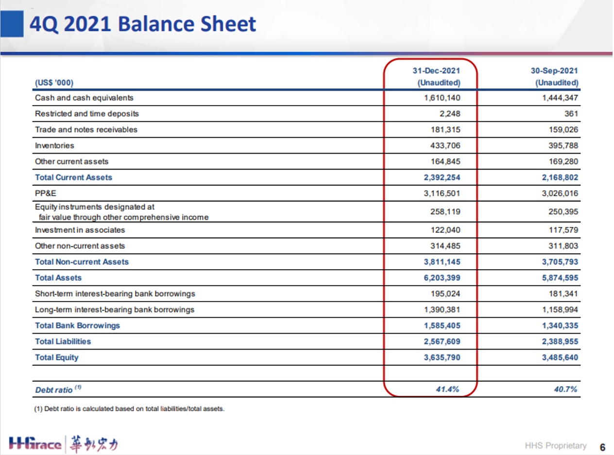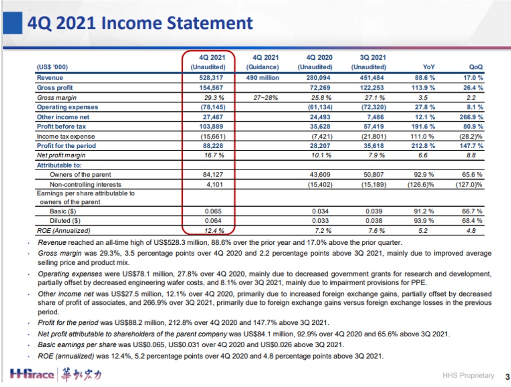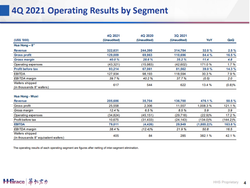 毛利率:29.3%,同比增长3.5%,环比增长2.2%,其中八吋厂的毛利率首次达到40%。从2021年全年来看,折合8英寸月产能同比增长约40%,销售收入同比增长近70%,达到16.308亿美元;