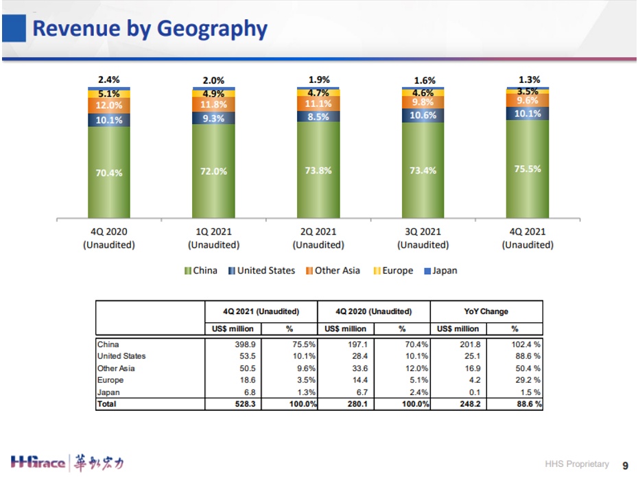 从地理位置上看,本季度来自中国的销售收入3.989亿美元,占营收总额的75.5%,同比增长102.4%,主要得益于各个技术平台的需求增加。