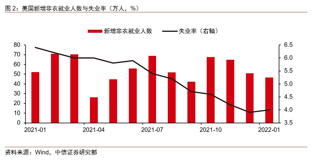 2022年1月美国新增非农就业人数超预期,劳动力参与率显著提升,显示美国就业市场稳步复苏,未明显受到Omicron变异毒株影响。美国1月新增非农就业人数46.7万人,远高于市场预期(-40万人~25万人),同时去年11月和12月新增非农就业人数分别上调至64.7万人和51万人,两月上调累计增长70.9万人。尽管失业率较去年12月的3.9%小幅回升至4.0%,但劳动力参与率显著提升0.3个百分点至62.2%,仅与2020年3月的62.7%相差0.5个百分点。从分项数据看,休闲和酒店业贡献了最大增幅,部分地区进入室内场所需要出示疫苗接种证明的规定或许在一定程度上提升了人们进入休闲酒店业工作的意愿。尽管2021年1月的家庭调查样本较2020年12月发生变化导致直接比较两月的数据可能存在误差,但是就业数据整体超预期的表现依然显示美国就业市场并未明显受到Omicron变异毒株的影响,仍走在稳步修复的道路上。
