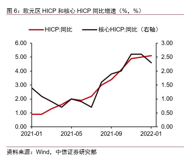欧洲央行在2月的议息会议上同样释放鹰派信号,其突然的转向完全超出市场预期。由于前一天公布的1月通胀数据创历史新高且远超市场预期,欧洲央行态度发生巨大转变。尽管会议声明总体符合预期,但会后欧洲央行行长拉加德的讲话则一展鹰派风格。首先,拉加德表示欧洲央行管委会一致担忧通胀高企时间长于预期;其次,她不再坚持此前一直强调的“2022年不太可能加息”的论断,表示“情况确实发生了变化”。其论调的突然转向与美联储主席鲍威尔首次表示“是时候放弃‘暂时性’这个词”有异曲同工之意,或预示着欧洲央行货币政策将正式开始转向。不过,即便欧洲央行开始加息,其首次加息的时点也将在停止扩表之后进行。同时,还需进一步关注后续欧元区通胀数据的变化。