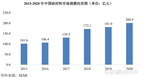 从行业规模来看,根据SEMI数据,2015年中国半导体硅材料市场规模为101.6亿元,2020年增长至200.9亿元,2015年至2020年复合增长率达到14.6%。国内半导体硅材料生产企业技术水平不断提升,中国市场占比持续上升。