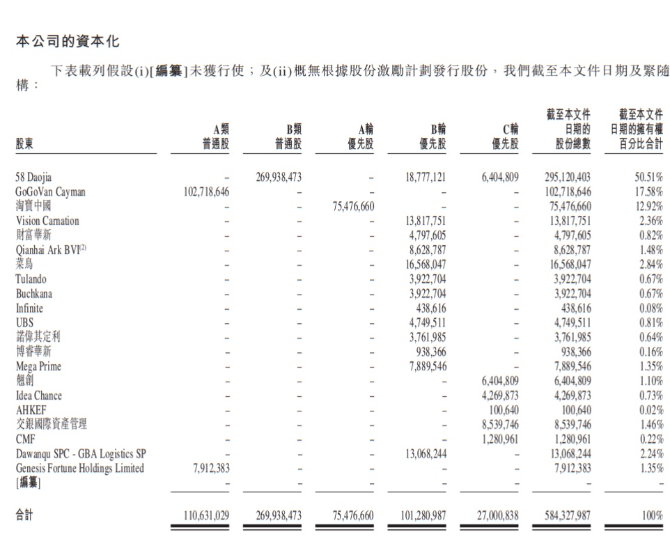 聆讯文件显示,IPO前,58 Daojia直接持有51.2%权益。58同城、Nihao China 及Trumpway Limited共同有权控制58 Daojia约77.5%投票权;淘宝中国持有快狗打车13.09%的股权,GoGoVan Cayman持股为17.82%,Vision Carnation持股为2.4%,菜鸟持股为2.87%。