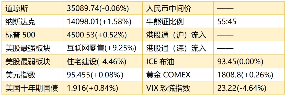 1.上周末美股截至收盘,道指跌21.42点,跌幅为0.06%,报35089.74点;纳指涨219.19点,涨幅为1.58%,报14098.01点;标普500指数涨23.09点,涨幅为0.52%,报4500.53点。上周道指上涨1.05%,标普500指数上涨1.55%,纳指上涨2.38%。港股ADR指数小幅上涨,按比例计算,收报24600点,较香港收市升27.19点,幅度为0.11%。