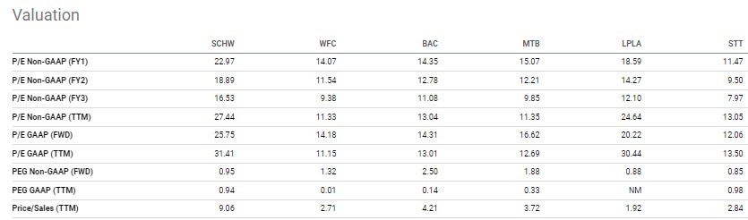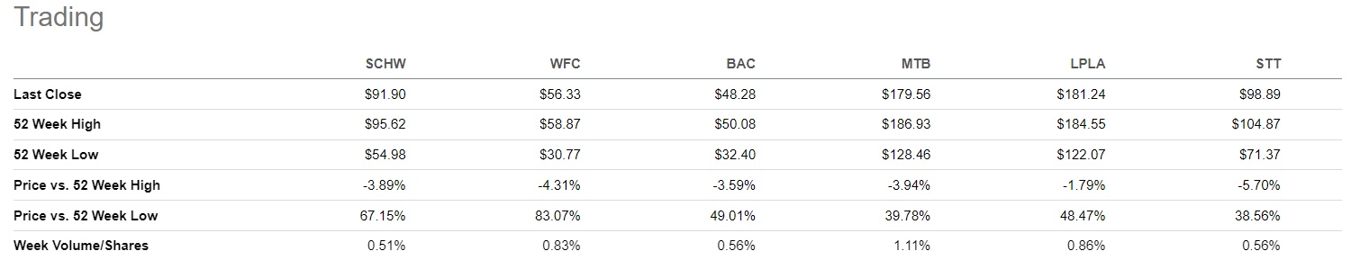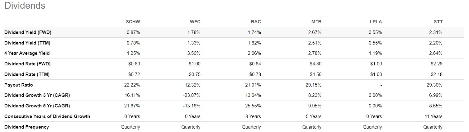 下图为嘉信理财、富国银行、美国银行、M&T Bank和LPL Financial估值、股息以及交易价格对比。