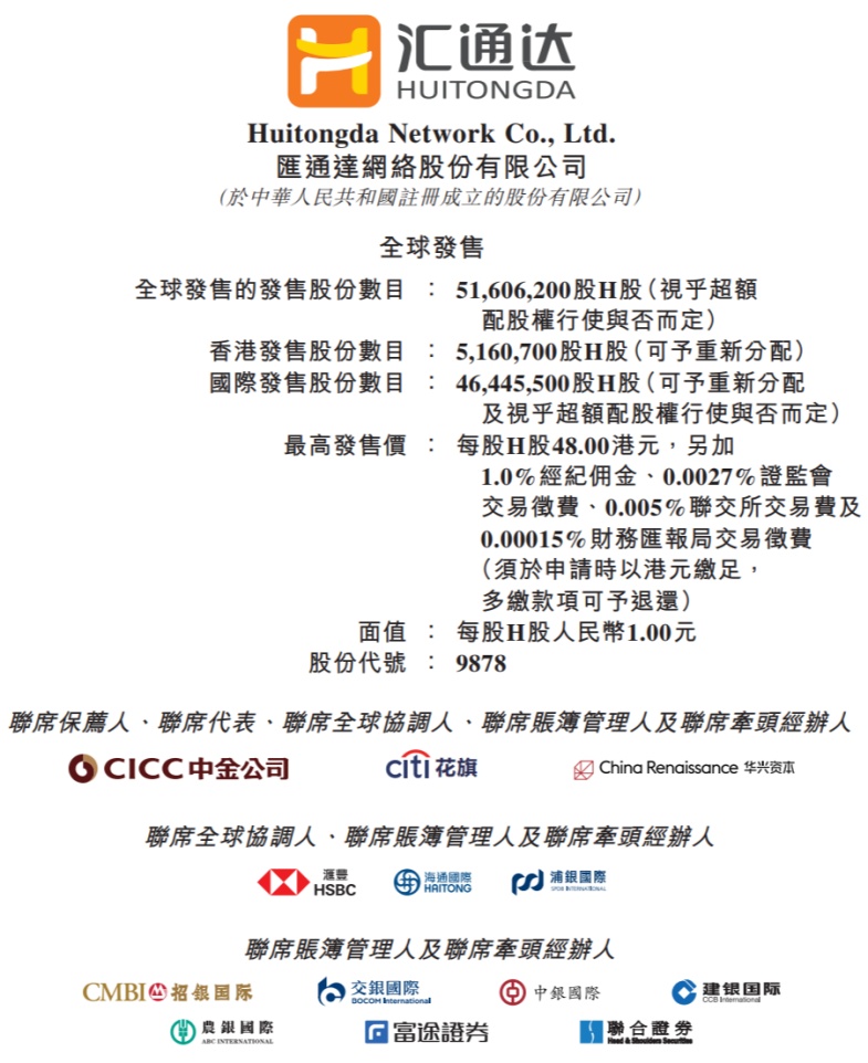 根据汇通达网络在1月31日的公告得知,公司拟全球发售5160.62万股,其中香港发售股份数目为516.07万股,国际发售股份数目为4644.55万股,另外有15%的超额配股权;此外,招股价定在43至48港元,每手股数为100股,入场费为4848.38港元,招股期截至2月10日,预计将于2月18日在联交所主板挂牌上市。