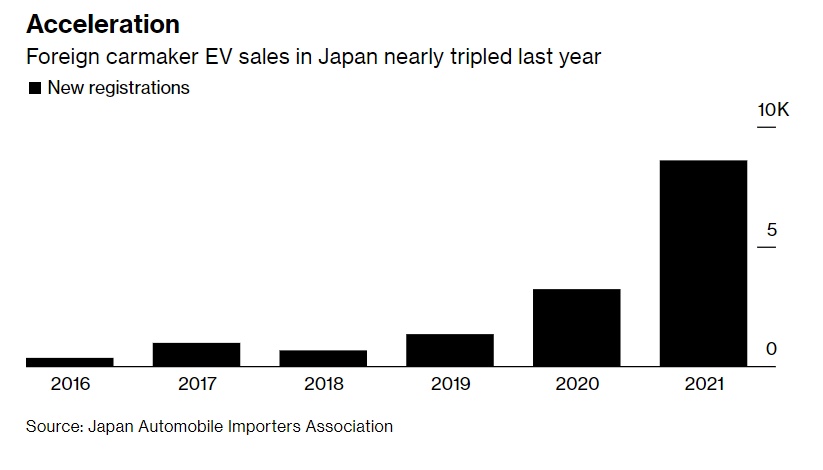 智通财经APP了解到,在2021年全年,日本进口电动汽车的新注册量增加了近两倍,达到8610辆,在一个整体汽车销售几乎停滞的国家,这是一个微小但显著的转变。