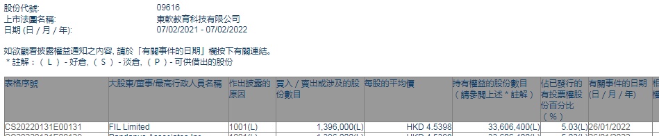 Limited增持东软教育(09616)139.6万股,每股作价4.5398港元,总金额约为633.76万港元。增持后最新持股数目约为3360.64万股,最新持股比例为5.03%。