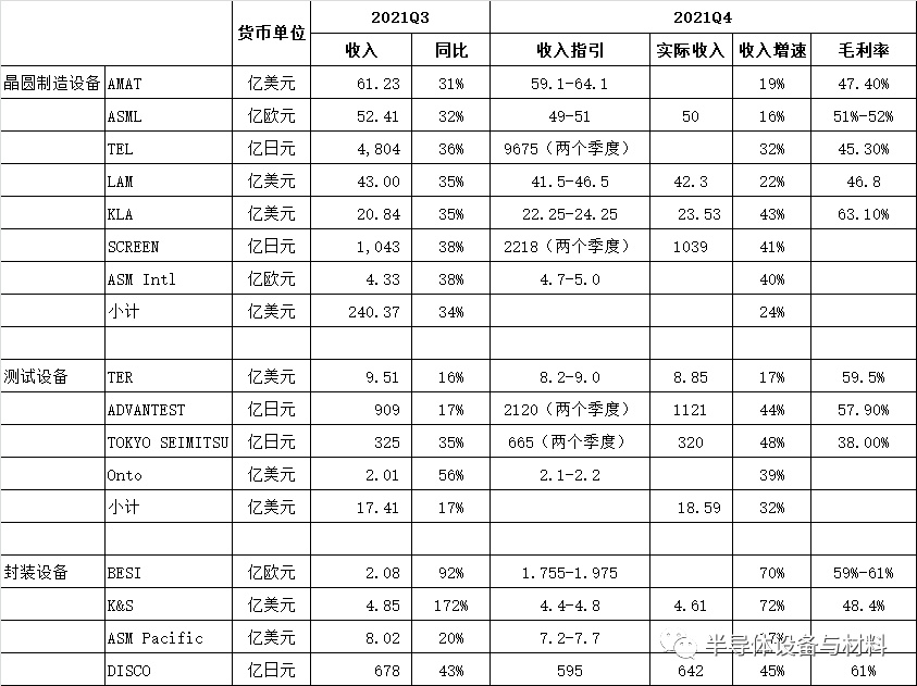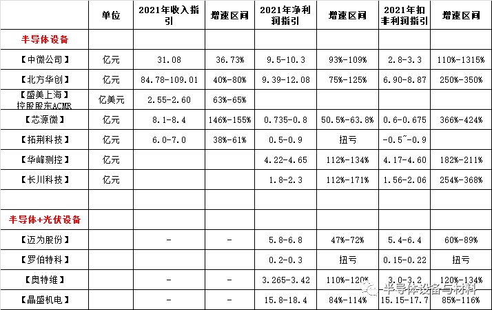 国内外半导体设备上市公司业绩预告统计 国际企业21Q4收入稳增