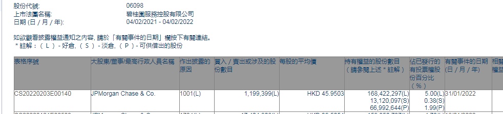 智通财经APP获悉,香港联交所最新资料显示,1月31日,小摩增持碧桂园服务(06098)119.9399万股,每股作价45.9503港元,总金额约为5511.27万港元。增持后最新持股数目约为1.68亿股,最新持股比例为5%。