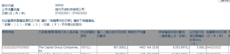 智通财经APP获悉,香港联交所最新资料显示,2月4日,美国资本集团增持时代天使(06699)90.1万股,每股作价144.323港元,总金额约为1.3亿港元。增持后最新持股数目约为855.37万股,最新持股比例为5.08%。