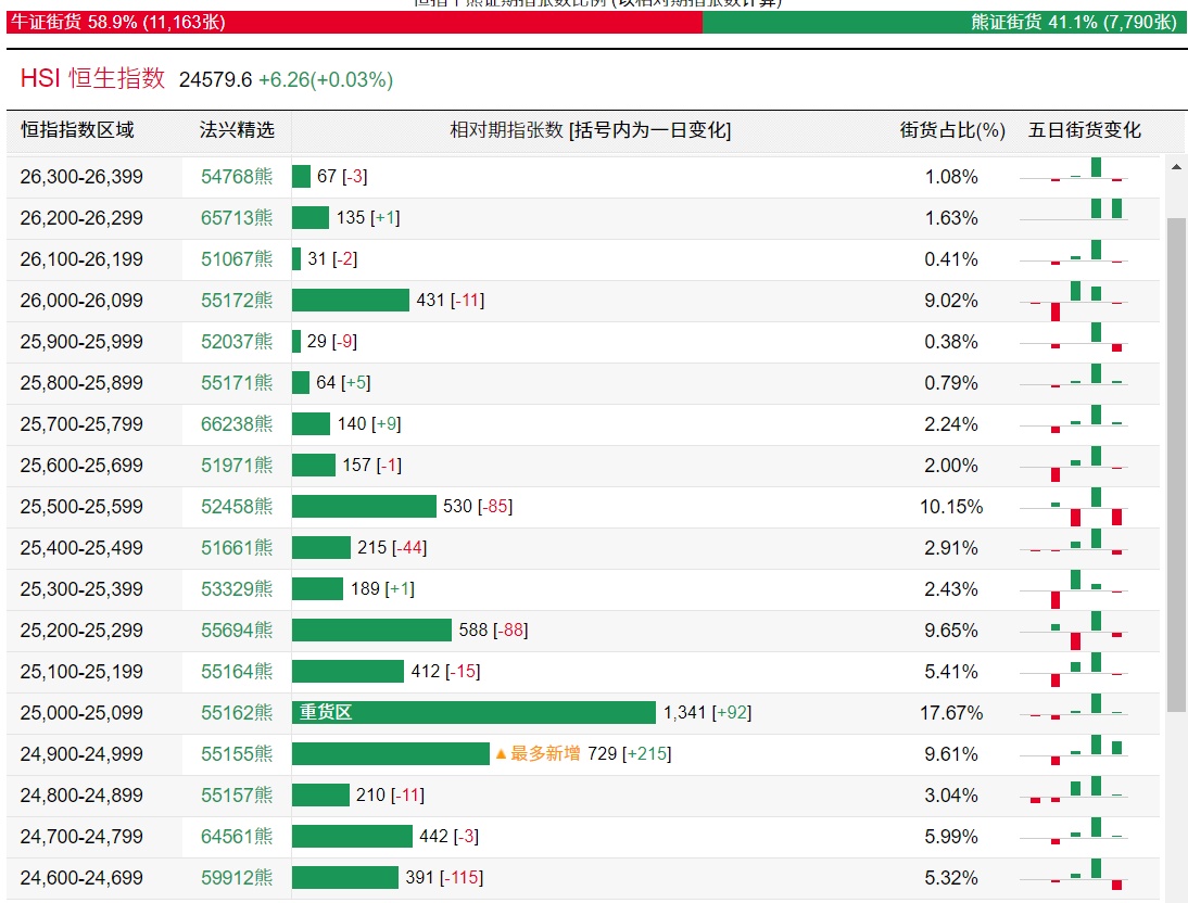 法兴恒指牛熊证街货分布图中的数据显示,熊证街货重货区在25000-25099区间,该区间最新熊证数量为1341张,较上一交易日增加92张;最多新增在24900-24999区间,该区间最新熊证数量为729张,较上一交易日增加215张。