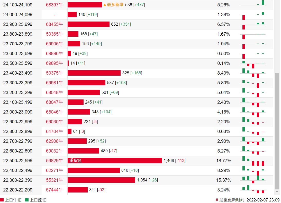 牛证街货重货区在22500-22599区间,该区间最新牛证数量为1468张,较上一交易日减少113张;最多新增在24100-24199区间,该区间最新牛证数量为536张,较上一交易日增加477张。
