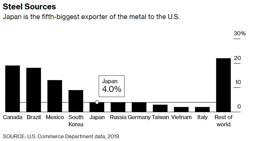 从数量上来看,根据美国商务部2019年的统计数据,日本只占美国钢材进口总量的4%左右,占美国金属消费量的1%左右。