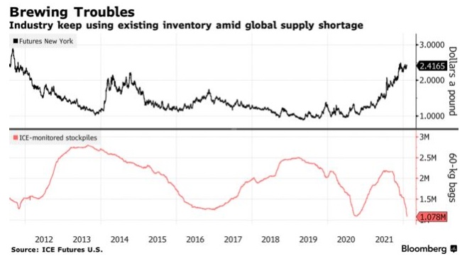 库存减少是一个令人担忧的问题,因为当各国无法从海外获得足够的产品时,库存就会被利用。这是需求超过供给的迹象,也是价格上涨的条件。在食品通胀影响全球之际,咖啡价格已经触及多年高位。