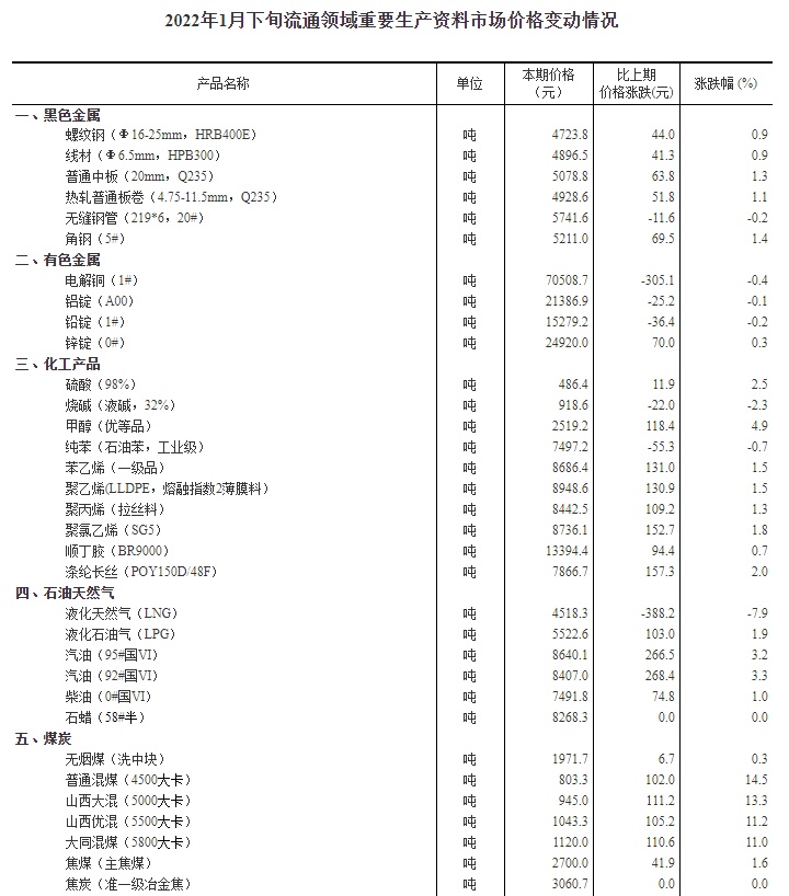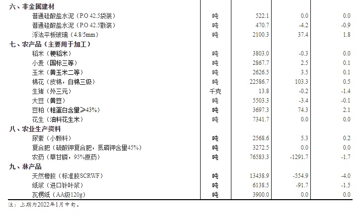 2022年1月下旬流通领域重要生产资料市场价格变动情况