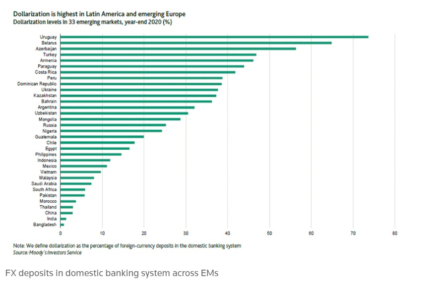 “对于没有进行对冲措施的贷款人来说,偿还外币贷款变得更加困难,更多储户则更倾向于取出资金。如果中央银行没有足够的各类外汇储备来救助美元短缺的银行,那么在危机时期,高度美元化也会威胁金融稳定。”穆迪分析师写道。