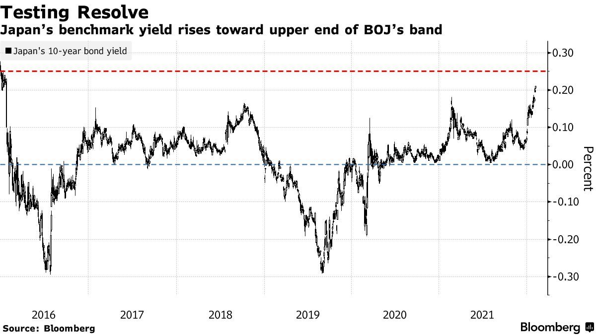 日本央行的反应将决定日本能否顶住全球收益率上升的压力,因交易员们正加大对货币政策正常化的押注。日本央行行长黑田东彦此前驳斥了加息的说法,称日本国内通胀依然疲弱,但全球债券价格重新定价的趋势仍在改变市场对日本债券的预期。