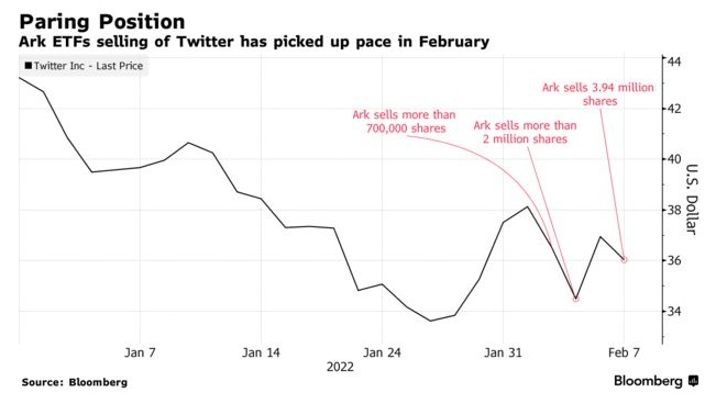 自去年12月底以来,ARK几乎每周都在出售推特股票,但本月的抛售速度有所加快。除本周一外,ARK在2月2日和2月3日还分别出售了70多万股和200多万股推特股票。