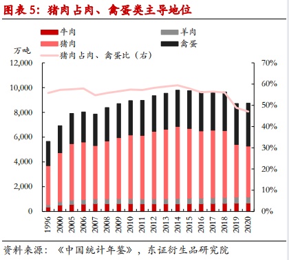 作为农业产业结构中不可或缺的组成部分,畜牧业在我国市场经济运行中的地位逐年提升。伴随现代畜牧业技术发展、肉蛋奶消费需求提升,我国畜牧业总产值自2016年以来维持在3万亿元附近,2020年产值首度向上突破4万亿元,较1978年209.3亿元增长近191倍。其中,猪肉作为我国居民肉蛋奶消费的第一大类产品,产量常年居于肉、禽蛋类主导地位。