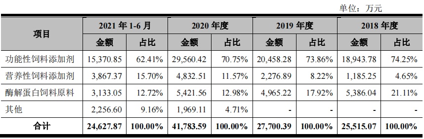 报告期内,美农生物的酶解蛋白饲料原料收入分别为5386.04万元、4965.22万元、5421.56万元、3133.05万元,销售规模总体保持稳定,占比则逐年下降。截至2021年6月末,该板块占公司主营业务比重已由2018年的超过二成缩水至12.72%。