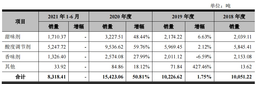 就具体品种来看,美农生物的功能性饲料添加剂包括甜味剂、酸度调节剂、香味剂和其他。期内,公司上述品种的销量均有较大幅度的提升。其中,甜味剂的销量由2018年的2039.11吨增加至2020年的3227.51吨,酸度调节剂由5845.41吨增加至9536.62吨,香味剂由2153.08吨增加至2574.08吨。