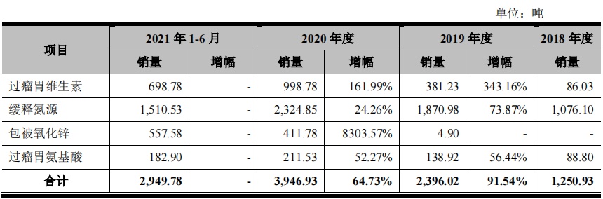 从具体品类看,公司的营养性饲料添加剂包括过瘤胃维生素、缓释氮源、包被氧化锌、过瘤胃氨基酸。逐项看,2019年度,过瘤胃维生素、缓释氮源、过瘤胃氨基酸等产品销量均大幅增长,其中过瘤胃维生素增幅高达343.16%。2020 年度,过瘤胃维生素、缓释氮源和过瘤胃氨基酸等销量依然保持了快速增长,但增幅变小;包被氧化锌于2019年末导入市场,2020 年迅速放量。各产品销量多点开花,直接刺激了公司的营养性饲料添加剂业务收入持续走高。