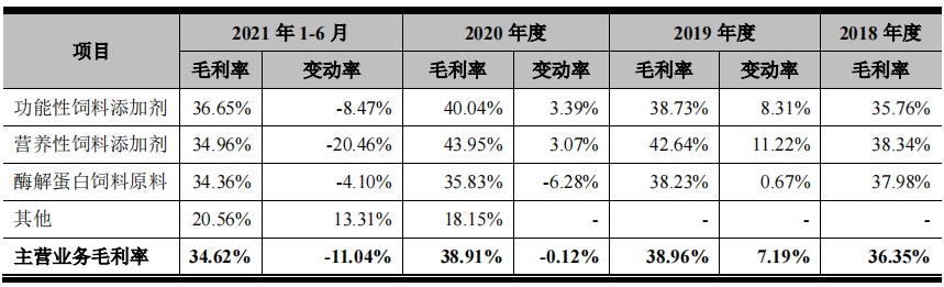 可见,美农生物2021年上半年的毛利率出现较大滑落,彼时公司主要业务功能性饲料添加剂、营养性饲料添加剂、酶解蛋白饲料原料的毛利率分别下降8.47%、20.46%、4.1%。