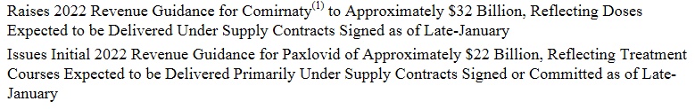 辉瑞预计,2022年,全年营收为980亿美元至1020亿美元,经调整的摊薄后每股收益为6.35美元至6.55美元;此外,将来自新冠疫苗Comirnaty的营收预测上调至约320亿美元;并初步预计新冠口服药Paxlovid营收约为220亿美元,但市场预期为248.8亿美元。