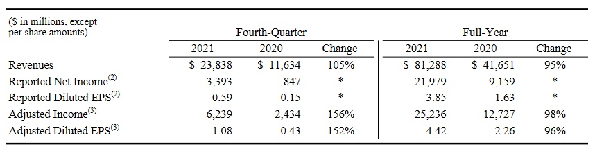 该公司2021年全年营收为812.88亿美元,上年同期为416.51亿美元,同比增长95%;归属于普通股股东的净利润为219.79亿美元,上年同期为91.59亿美元;调整后的净利润为252.36亿美元,上年同期为127.27亿美元,同比增长98%。