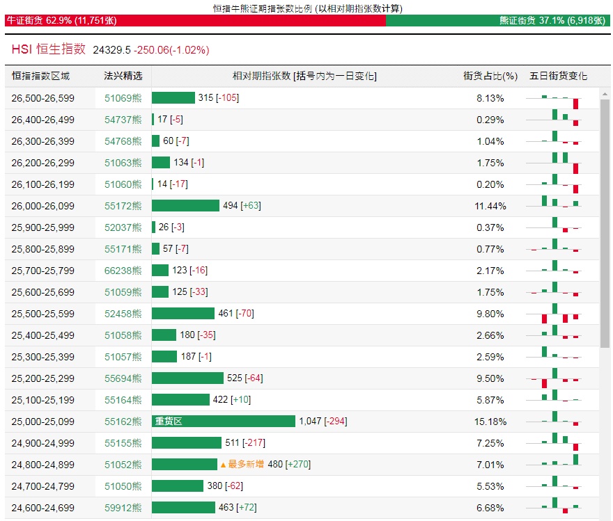 法兴恒指牛熊证街货分布图中的数据显示,熊证街货重货区在25000-25099区间,该区间最新熊证数量为1047张,较上一交易日减少294张;最多新增在24800-24899区间,该区间最新熊证数量为480张,较上一交易日增加270张。
