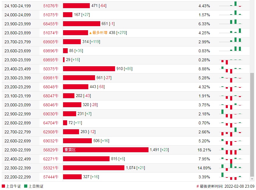 牛证街货重货区在22500-22599区间,该区间最新牛证数量为1491张,较上一交易日增加23张;最多新增在23800-23899区间,该区间最新牛证数量为438张,较上一交易日增加270张。