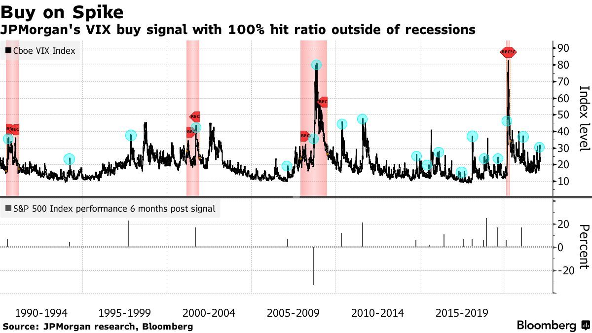 智通财经APP获悉,摩根大通策略师们已经确定在他们眼中几乎100%可靠的指标正强化他们的观点,即股市即将强势反弹的观点。由Mislav Matejka领导的摩根大通策略师团队表示,当芝加哥期权交易所波动率指数(VIX指数)上涨并超过其1个月移动平均线的50%时,买入信号就会触发。